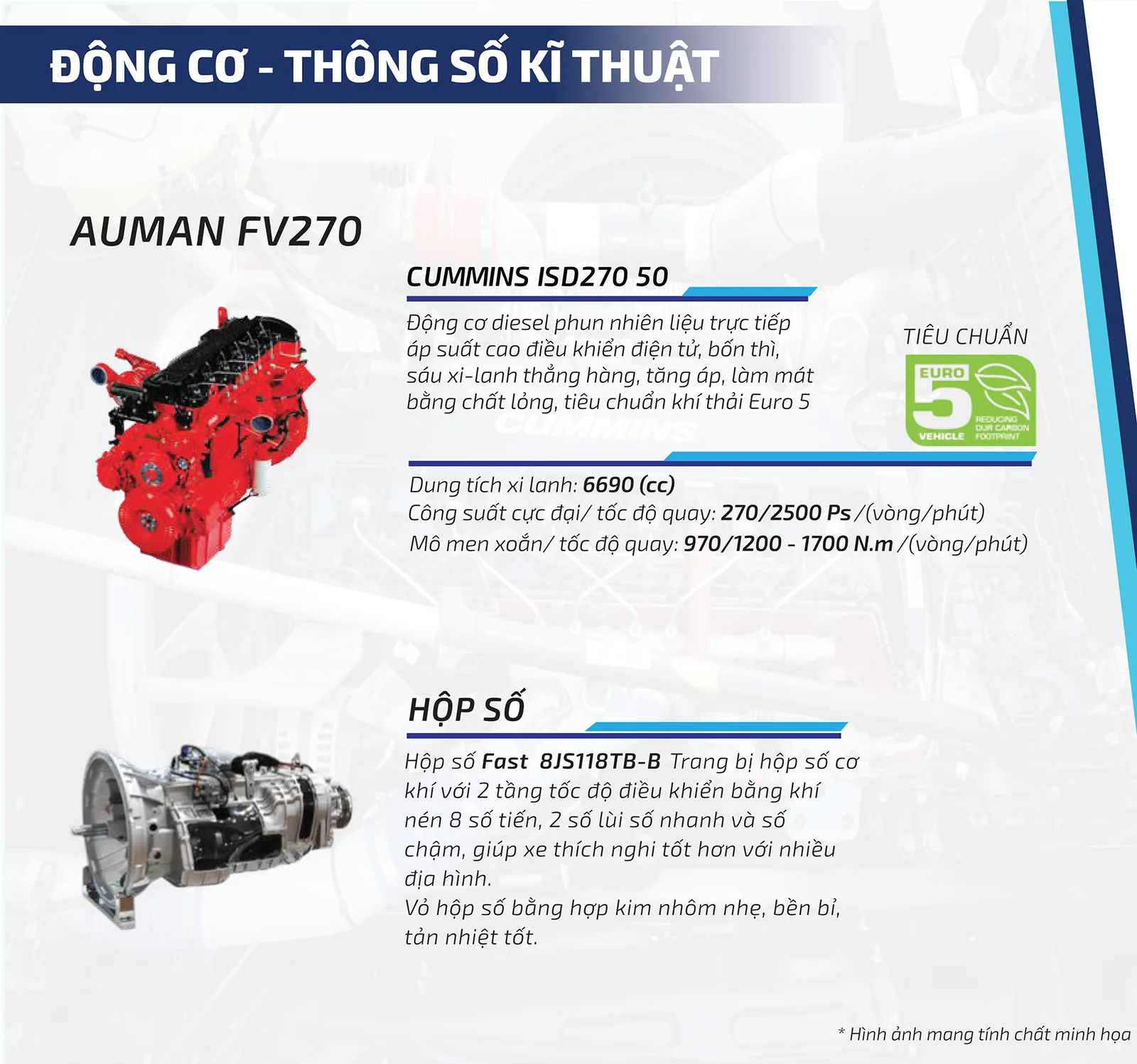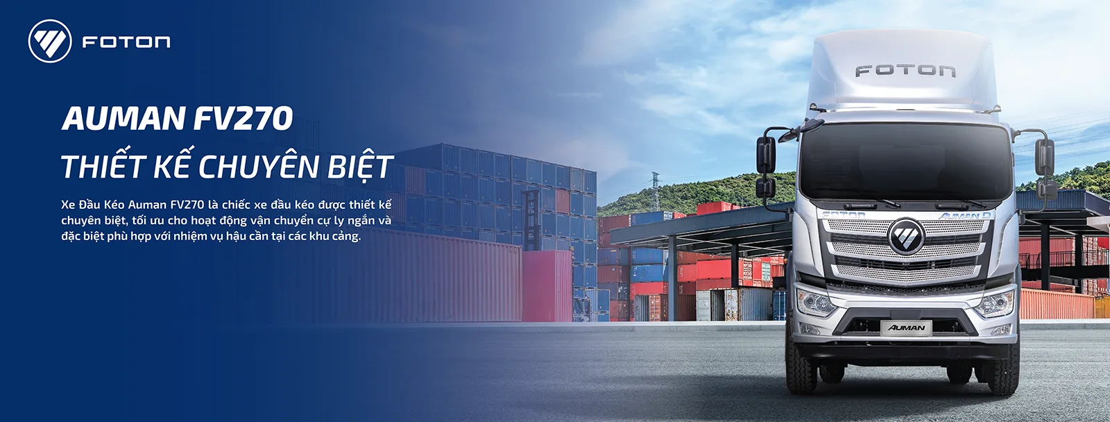 Foton Auman FV270 là một xe đầu kéo 4 x 2, sức khéo 29 tấn, được cấu hình phù hợp với vận chuyển hậu cần cảng, đặc biệt là xử lý nhẹ, quay dễ dàng và tiết kiệm nhiên liệu hiệu quả cao. Với động cơ Cummins ISD270 50, hộp số tay Fast 8, chiều rộng cabin 2200mm, độ bền cabin đáp ứng các yêu cầu của tiêu chuẩn châu Âu.