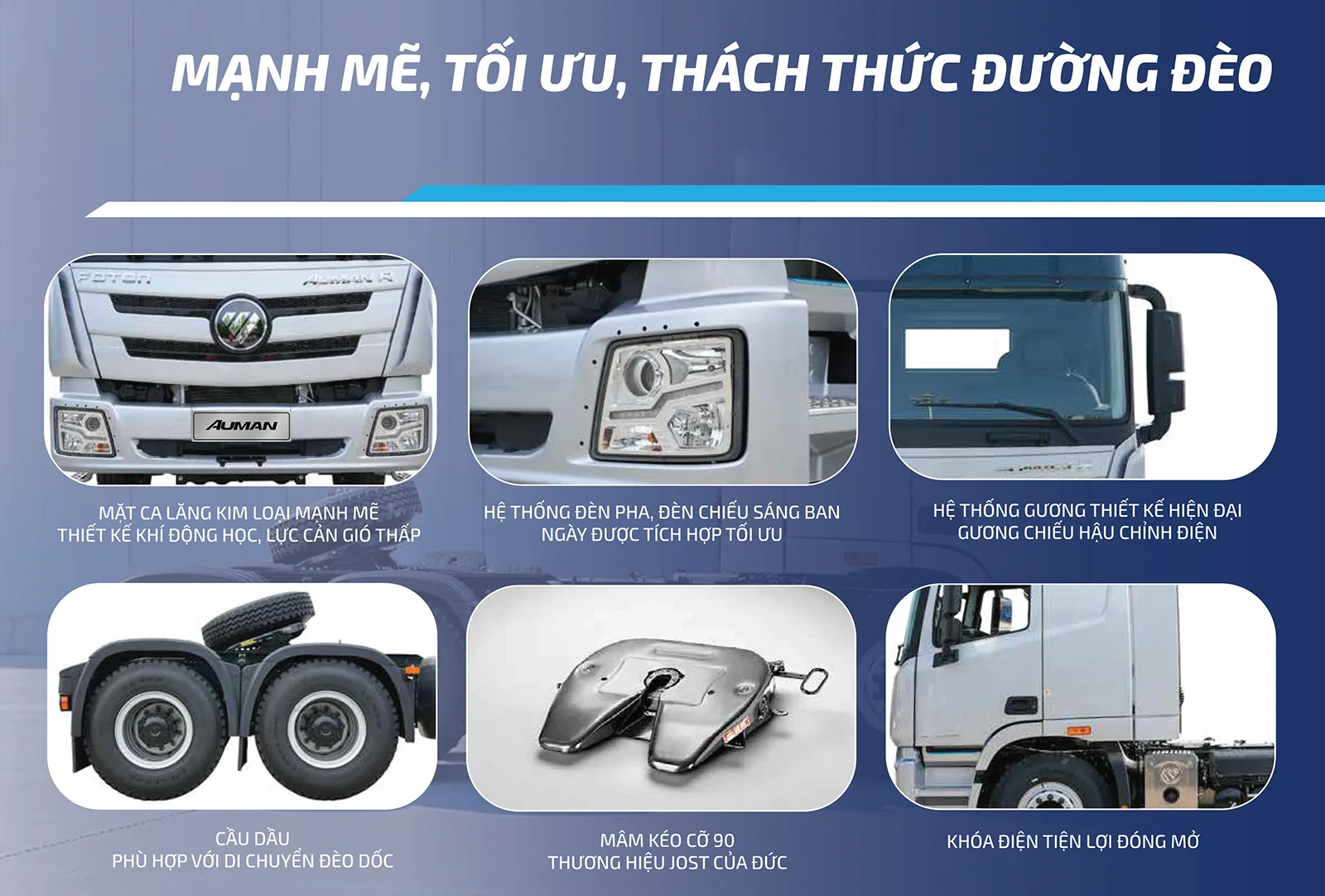 Foton Auman GTL Là loại xe đầu kéo hạng nặng, cấu hình đặc biệt phù hợp với vận tải hạng nặng tại Việt Nam, đặc biệt là hiệu suất đáng tin cậy, bền bỉ của cả xe, đảm bảo an toàn vận tải hạng nặng. Kết hợp với động cơ Cummins ISGe5-460, hộp số tay 12 số Fast và cầu sau 16 tấn của Benz Craft. Có tính năng nổi bật như tiết kiệm nhiên liệu, an toàn, đáng tin cậy, tính thoải mái cao.