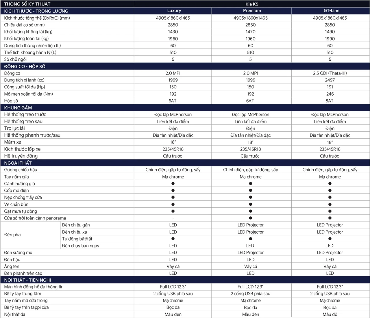 Thông số của KIA K5